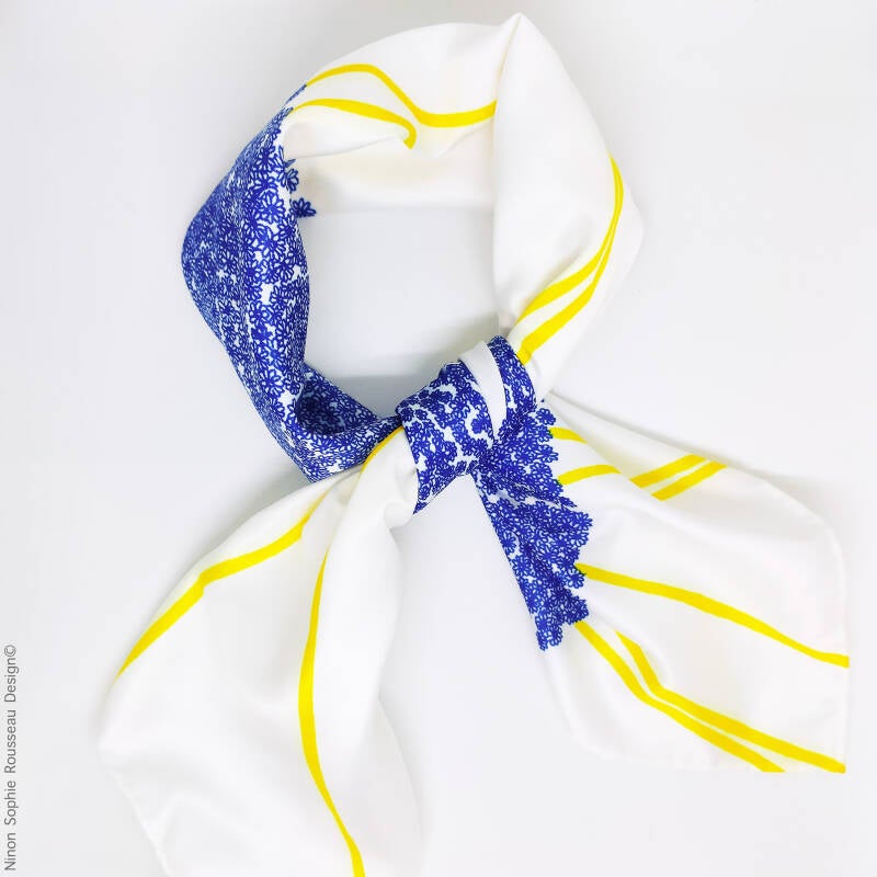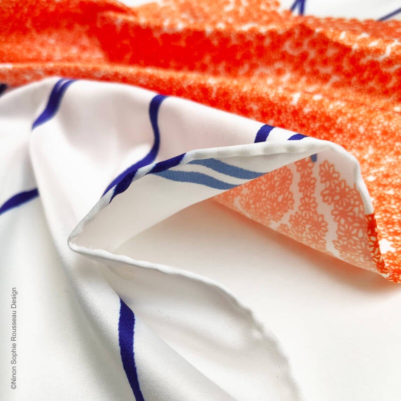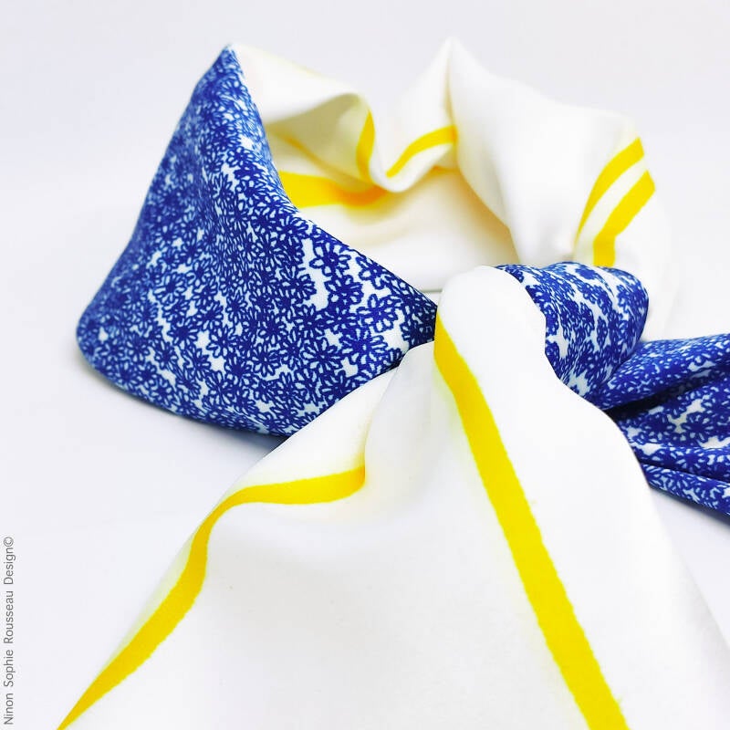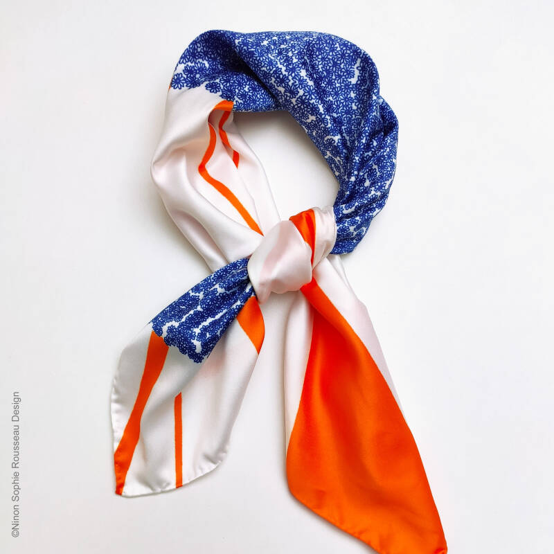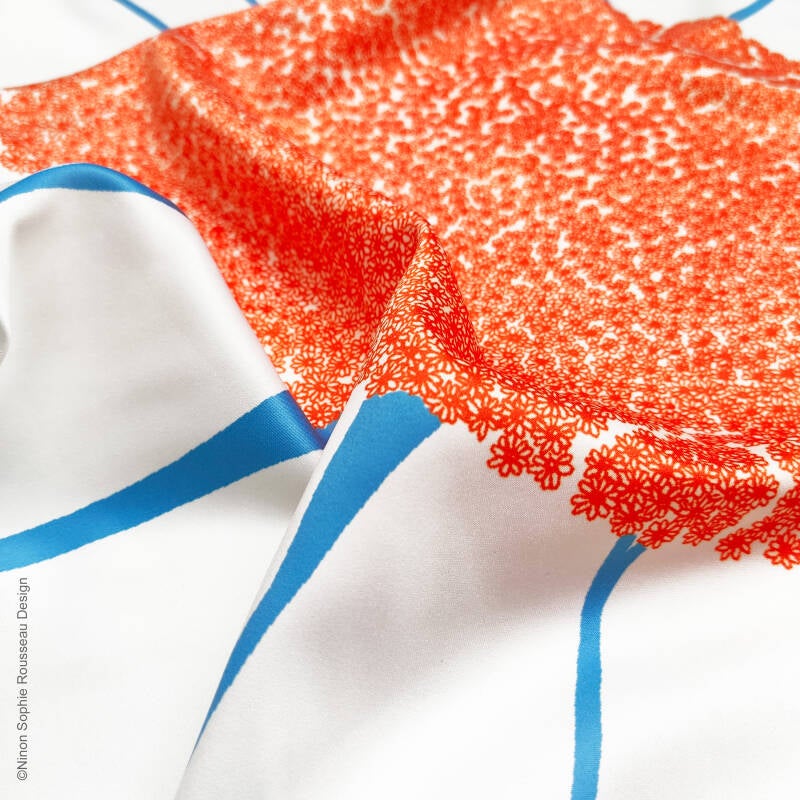 Format : 57x57cm à 60x60cm (les ourlets faits à la main entrainent de légères variations de dimensions d'un produit à l'autre).                                                                                                                                                                                                                                   Matières : 100% polyester recyclé.                                                                                                                                                                                                                                                                                                                                                                                                                                                      Entretien : Lavage à la main pour protéger les ourlets. Repassage doux. Repassage fort et vapeur possibles avec tissu en coton de protection entre le foulard et le fer.