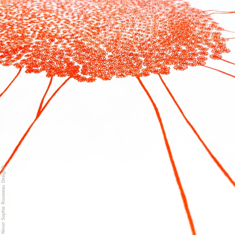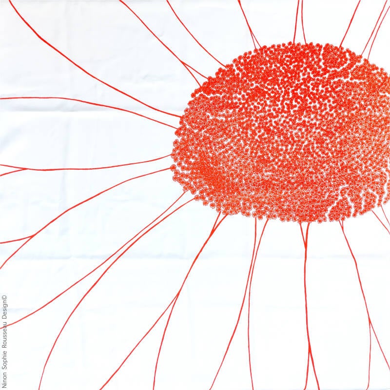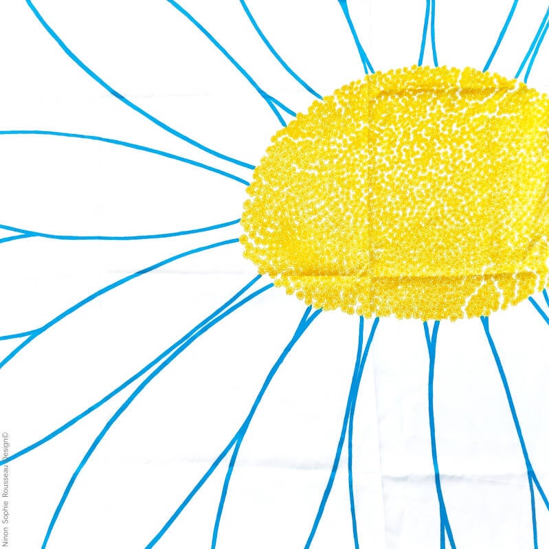 Pâquerette et ses nombreux coloris est issu d'un dessin au stylo. Il représente de manière poétique la réalité botanique de la pâquerette, une plante composée de plusieurs fleurs de la famille des astéracées.
