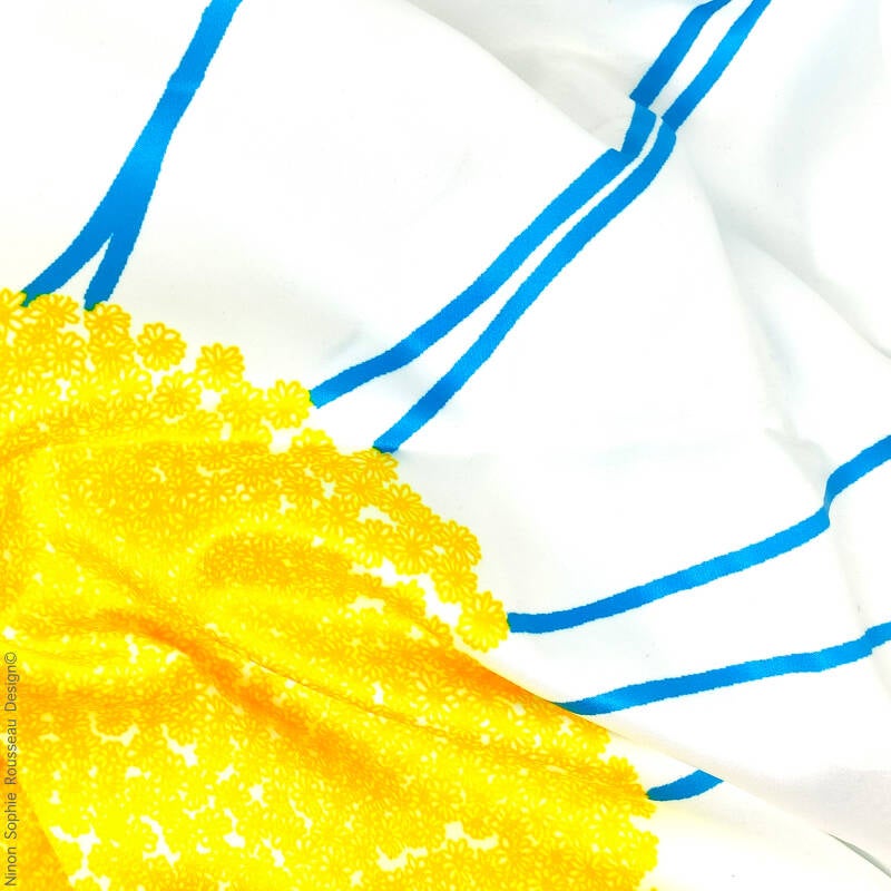 Format : 57x57cm à 60x60cm (les ourlets faits à la main entrainent de légères variations de dimensions d'un produit à l'autre).                                                                                                                                                                                                                                   Matières : 100% polyester recyclé                                                                                                                                                                                                                                                                                                                                                                                                                                                       Entretien : Lavage à la main pour protéger les ourlets. Repassage doux. Repassage fort et vapeur possibles avec tissu en coton de protection entre le foulard et le fer.