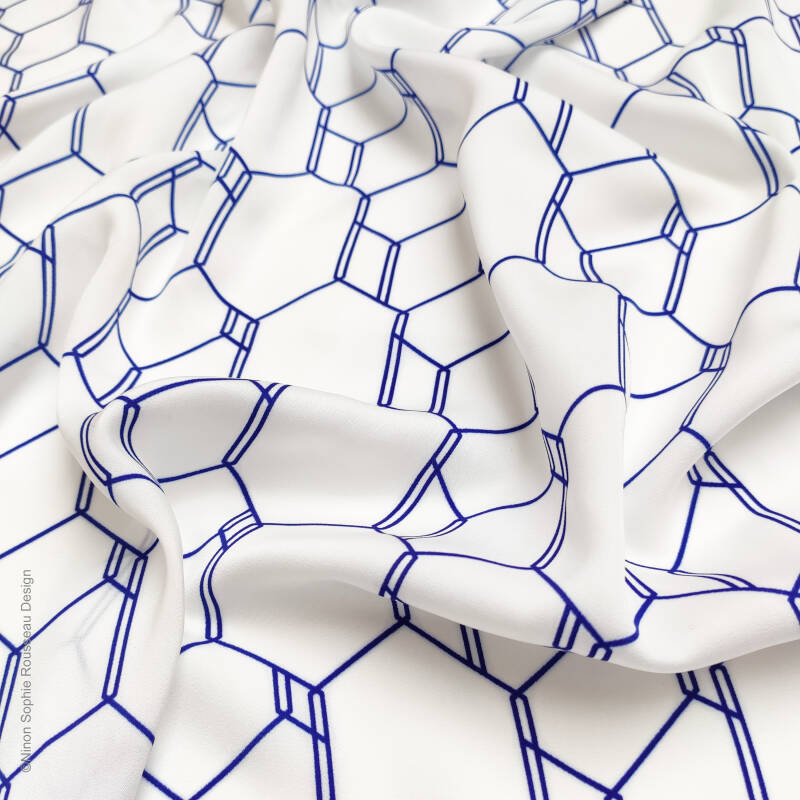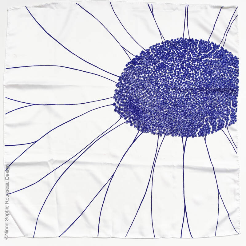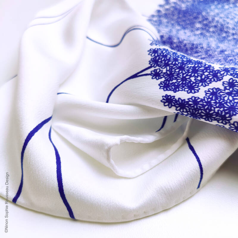 Format : 57x57cm à 60x60cm (les ourlets faits à la main entrainent de légères variations de dimensions d'un produit à l'autre).                                                                                                                                                                                                                                   Matières : 100% polyester recyclé.                                                                                                                                                                                                                                                                                                                                                                                                                                                   Entretien : Lavage à la main pour protéger les ourlets. Repassage doux. Repassage fort et vapeur possibles avec tissu en coton de protection entre le foulard et le fer.
