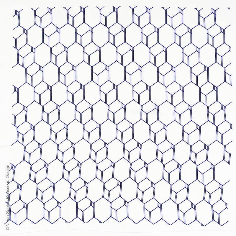 J'ai imaginé Ruche alors que je travaillais sur des motifs tissés dits "nid d'abeille". Je voulais intégrer les insectes pollinisateurs dans ma collection de tissages et jouer avec le nom "nid d'abeille" pour  représenter l'abeille. Petit à petit, en modifiant l'armure de mon nid d'abeille, j'ai obtenu le tracé du motif Ruche